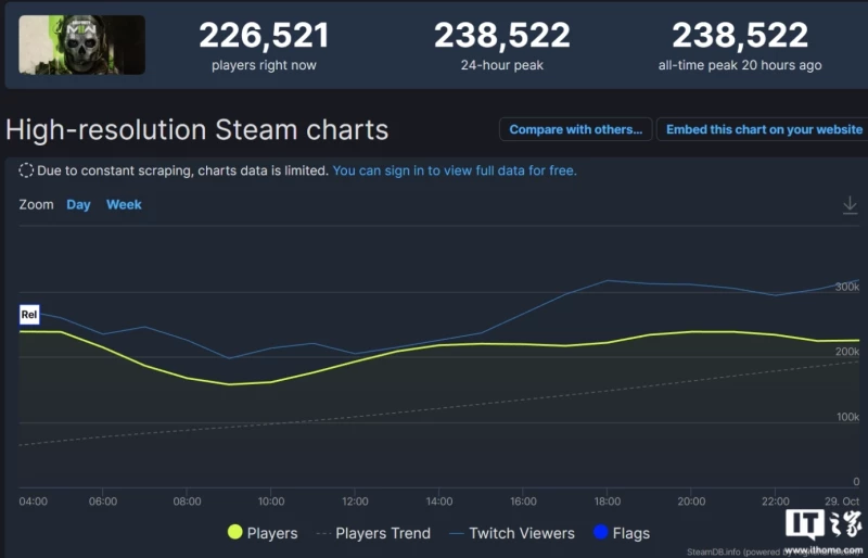 Dữ liệu SteamDB ghi nhận số lượng người chơi trực tuyến tối đa trên Steam của “Call of Duty 19: Modern Warfare 2” đạt kỷ lục 238.522.