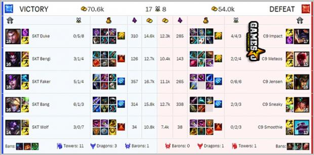 SKT đã có một trận đấu hoàn hảo khi áp đặt được đối thủ từ đầu tới cuối mà không để bị nằm xuống bất cứ lần nào cho đến khi đồng hồ điểm phút 20. Trận đấu khép lại với tỉ số 17-8 sau 34 phút, với chênh lệch về trụ là 11-1 nghiêng về phía các tuyển thủ tới từ LCK Hàn Quốc.