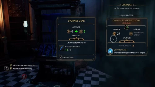 Thiết bị của người chơi có thể được nâng cấp bằng cách mang nó đến Khung dệt, thiết bị này có thể được mở khóa và tìm thấy trong Phòng Yêu cầu . Hầu hết các mặt hàng quần áo đều có ba cấp độ, có thể được nâng cấp bằng cách sử dụng các tài nguyên thu được từ Vivarium, giúp tăng chỉ số phòng thủ và tấn công phép thuật của trang phục đó.