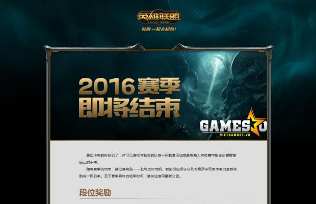 Trang phục Vinh Quang là phần thưởng dành cho những người chơi đạt bậc Vàng trở lên trong suốt quá trình đánh xếp hạng của mùa giải. Hiện vẫn chưa rõ ngày mùa giải 2016 kết thúc. Thông thường, mùa giải xếp hạng sẽ khóa lại trong quãng thời gian từ đầu cho tới giữa tháng 11 ngay sau khi giải đấu CKTG tìm ra nhà vô địch.