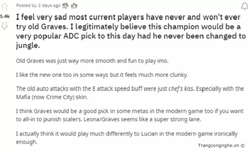 Ngày 30 tháng 3, game thủ đăng tải bài viết của mình với nội dung 'Graves cũ bắn mượt và thú vị hơn rất nhiều.' Nhiều người đã đồng ý với ý kiến này và cho rằng họ rất thích kỹ năng E của Graves trước khi được cập nhật lại.