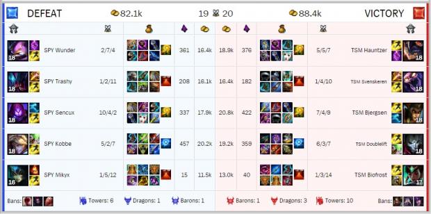 Nhưng lối chơi có phần vô kỷ luật của Splyce từ giữa cho tới cuối trận đã dẫn đến hậu quả nghiêm trọng. TSM ăn được Baron và Rồng Ngàn Tuổi chỉ trong ít phút ngắn ngủi. Phút 44, TSM phá hủy thành công nhà chính của Splyce và giành chiến thắng chung cuộc.