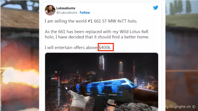 Theo Neowin, Counter-Strike: Global Offensive (CS:GO) của Valve là một trò chơi miễn phí, tuy nhiên người chơi có thể mua các vật phẩm cho nhân vật trong trò chơi. Những vật phẩm hiếm có được ưa chuộng bởi người chơi và họ sẵn sàng chi hàng ngàn đô la, thậm chí hàng trăm ngàn đô la để sở hữu chúng. Một game thủ mới đây đã chi tiêu số tiền lớn để sở hữu một vật phẩm trong trò chơi CS: GO.