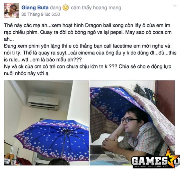 'Thế này các mẹ à, xem hoạt hình Dragon Ball xong còn lấy ô của em làm rạp chiếu phim. Quay ra đòi có bỏng ngô với lại pepsi. May sao có coca các mẹ ạ. Đang xem phim yên lặng thì em có thằng bạn call facetime em mới nghe và nói ti tý. Thế là quay ra suỵt...cái cinema của ông ấy không được dùng điện thoại...wtf em là bảo mẫu à?