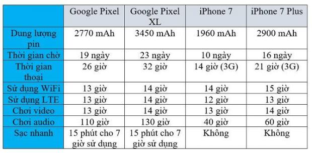 PhoneArena đã thử làm một bài so sánh nhỏ về thời lượng dùng pin của Google Pixel và Pixel XL với iPhone 7, iPhone 7 Plus – 2 chiếc điện thoại mới nhất của Apple. Tất nhiên, thông số mà PhoneArena dùng để so sánh là do Google và Apple cung cấp.