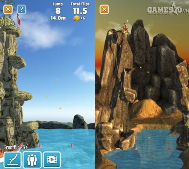 Tựa game casual Flip Diving sẽ đưa người chơi điều khiển nhân vật đứng ở một điểm cao nào đó và thực hiện những động tác nhào lộn. Điểm cao ở đây có thể là trên một chiếc xà gỗ được thiết kế lắp đặt bên vách núi, trên nắp phòng điều khiển của chiếc ca nô, trên đỉnh của một nhà thờ hoặc đơn giản là trên bậc nhảy cầu giống với các vận động viên nhảy cầu chuyên nghiệp.