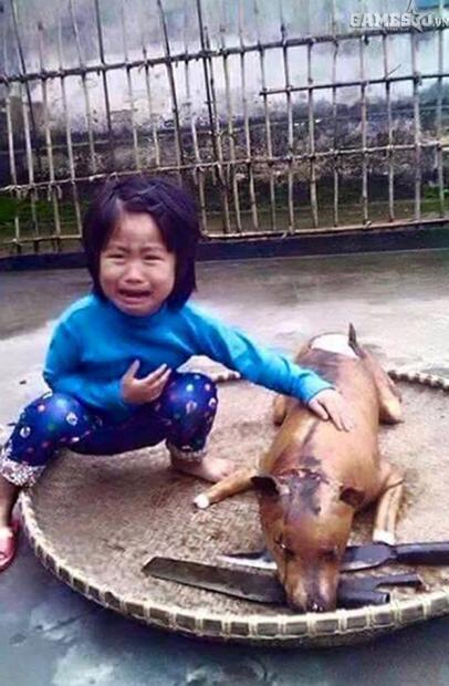 Vậy mà tôi cũng từng như bé gái trong ảnh, chứng kiến người thân (bố dượng) bắt cô chó cưng vào bao rồi đem đi thịt. Tôi không dám đối diện với xác của nó đã được thui vàng, chỉ biết chui ra sau nhà ngồi một xó khóc lóc, ấm ức. Suốt một thời gian dài sau đó, tôi thấy trống trải, hụt hẫng, cô đơn bởi trước giờ ngoài cô chó ra tôi chưa từng thân thiết với người bạn nào như thế'.