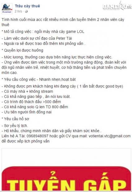 Hiện tại, các hoạt động cày thuê của máy chủ Việt Nam chủ yếu nằm trong tay những 'tập đoàn lớn' lũng loạn. Ngoài miền bắc có thể kể đến King Of War, trong miền nam là Trâu Best Udyr... Cách đây không lâu, Trâu còn 'báo hiệu' cho game thủ Việt rằng mùa cày thuê đã tới bằng việc - tuyển nhân viên mới. Khá hài hước, Thánh Cày Thuê một thời của LMHT Việt Nam muốn tuyển người có trình độ Solo Queue Thách Đấu từ 800 điểm trở lên. Yêu cầu có phần còn cao hơn đa số đội tuyển chuyên nghiệp.