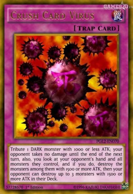 Bản thân Crush Card Virus cũng đã là một lá bài rất mạnh và bị cấm đem đi thi đấu, nó có hiệu ứng giúp bài thủ hy sinh một quái vật hệ bóng tối (Dark) có sức công dưới 1000, địch thủ sẽ được kháng sát thương trong một lượt, nhưng đổi lại chủ nhân của Crush Card Virus được soi bài của đối thủ, và phá hủy hết tất cả các quái thú có sức công trên 1500, rồi lại bắt đối thủ phải tự kết liễu 3 quân bài có sức công trên 1500 trong bộ bài của mình.