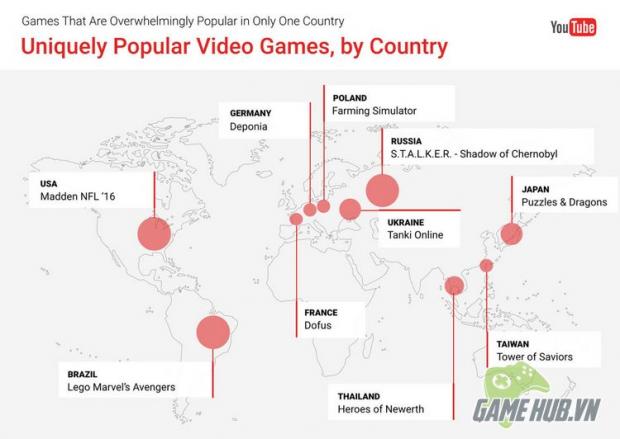 Bên cạnh đó bảng xếp hạng của Youtube cũng cho thấy những 'sản phẩm cây nhà lá vườn' mang sức ảnh hưởng lớn ngay tại nơi mình sinh ra. Ví như tại Mỹ - nơi ưa chuộng bộ môn bóng bầu dục, có mối quan tâm hết sức đặc biệt đến NFL 16. Trong khi đó tại Pháp, tựa game MMORPG Dofus lại đang nhận về sự quan tâm không hề nhỏ dù đã có tuổi đời vào hàng lão. Bên cạnh đó tựa gMO Puzzle and Dragons do đội ngũ Nhật Bản GungHo Entertainment phát triển cũng khẳng định vị trí ngôi vương tại quê nhà.