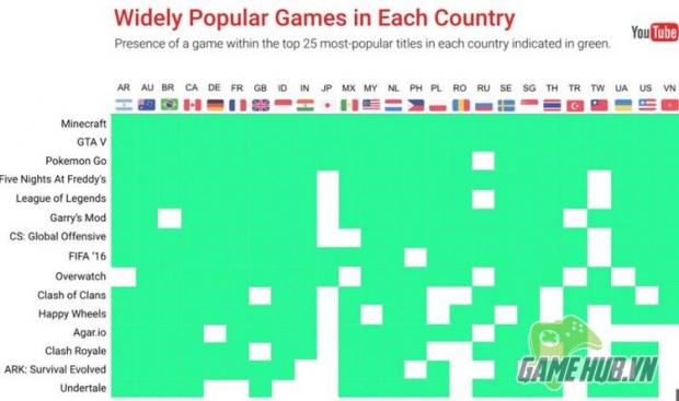 Dựa trên điều đó Youtube đã thống kê dữ liệu của mình để lọc ra những tựa game phổ biến nhất trên tổng số 25 quốc gia được lựa chọn, và bất ngờ thay trong đó có Việt Nam của chúng ta. Tất nhiên với vai trò của một website chuyên về video, Youtube dựa trên lượt xem về game của từng quốc gia trong năm 2016 để đưa ra con số cuối cùng. Và kết quả có lẽ sẽ khiến ít nhiều bạn đọc bất ngờ.