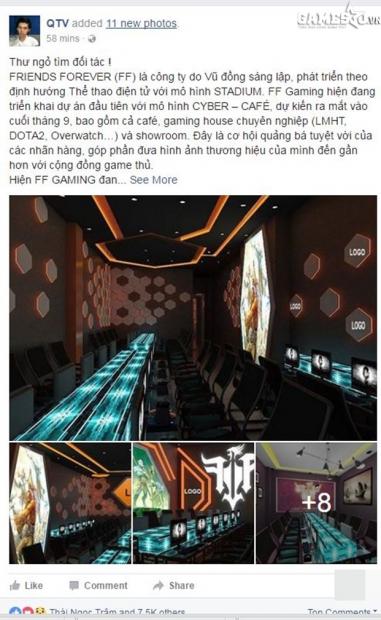FRIENDS FOREVER (FF) là công ty do Vũ đồng sáng lập, phát triển theo định hướng Thể thao điện tử với mô hình STADIUM. FF Gaming hiện đang triển khai dự án đầu tiên với mô hình CYBER – CAFÉ, dự kiến ra mắt vào cuối tháng 9, bao gồm cả café, gaming house chuyên nghiệp (LMHT, DOTA2, Overwatch…) và showroom. Đây là cơ hội quảng bá tuyệt vời của các nhãn hàng, góp phần đưa hình ảnh thương hiệu của mình đến gần hơn với cộng đồng game thủ.