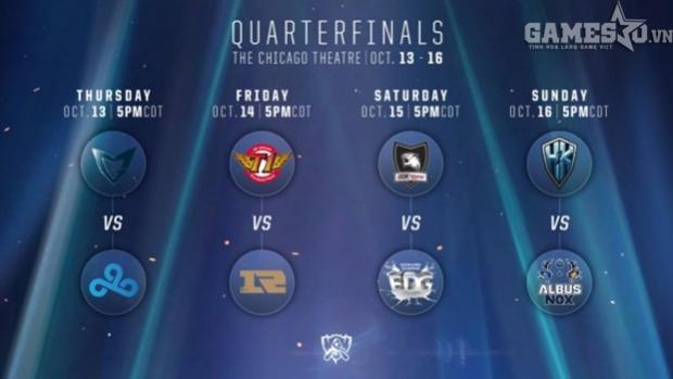 Các trận đấu trong khuôn khổ vòng tứ kết của giải đấu CKTG 2016 sẽ được tường thuật trực tiếp trên các kênh stream chính thức của Vietnam Esports TV (VETV.vn, Youtube VETV). Các bạn hãy chú ý đón xem nhé! Ngoài ra, cập nhật những tin tức mới nhất về CKTG 2016 tại GameSao nhé!