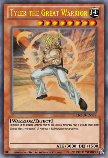 Nhận ra Calích (Trunks) trong Bảy Viên Ngọc Rồng (Dragon Ball) chứ? Thế giới chưa từng ghi nhận một vụ giao dịch nào liên quan đến Tyler the Great Warrior, nếu có thì giá trị của tấm bài này cũng chẳng hề rẻ! Người ta chỉ biết rằng có 3 lá bài Tyler the Great Warrior thực sự tồn tại, và mang mã bài vô cùng đặc biệt, TYL-EN001. Được sản xuất theo yêu cầu của quỹ bảo trợ Make a Wish America.