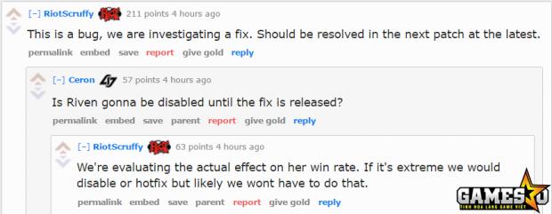 Phàn hổi chính thức từ phía Riot cho rằng, đó chỉ là một lỗi nhưng sẽ không sửa cho tới bản cập nhật tiếp theo trừ khi tỉ lệ chiến thắng của Riven tăng lên bất thường.