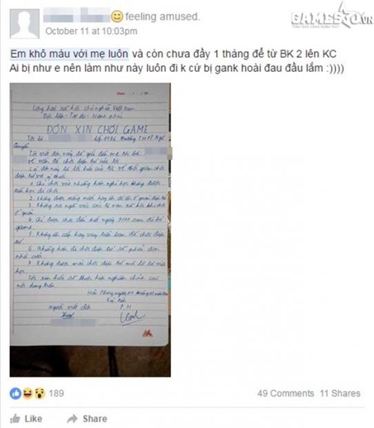 Mới đây, một game thủ cũng tương tự như các bạn bè đồng trang lứa, bị phụ huynh cấm chơi game. Tuy nhiên, thay vì lén lút chơi Liên Minh Huyền Thoại, né tránh sự phát hiện của bố mẹ, game thủ này đã vô cùng thẳng thắn, bày tỏ nỗi niềm của mình bằng cách viết 'đơn xin chơi game'.