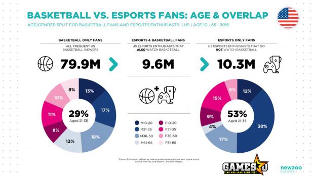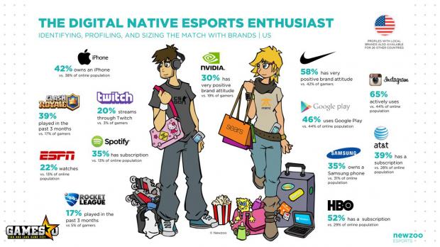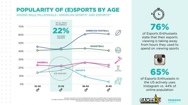 Độ phổ biến của eSports giảm mạnh ở những lứa tuổi già hơn, khi 73% fan hâm mộ thể thao điện tử dưới 35 tuổi. Bản báo cáo của Newzoo đề cập, những gì hấp dẫn khán giả nhất khiến cho các thương hiệu thể thao, người nổi tiếng và giới đầu tư nhảy vào eSports đều liên quan đến nội dung số, ngân hàng cùng phương tiện truyền thông.