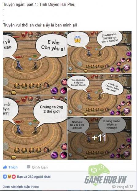 Chuyện là, từ những hình ảnh chụp màn hình chơi giữa 2 nhân vật trong game, một nữ game thủ đã “nhanh tay vui trí” chế thành câu chuyện tình yêu giữa nữ hiệp và nam hùng đậm chất chia ly ngôn tình nhưng lại có cái kết bất ngờ. Truyện tranh chế này đã được “chủ thớt” đăng tải trên group Ỷ Thiên 3D Hội quán mới đây và ngay lập tức thu hút sự chú ý cũng như tương tác của cộng đồng game thủ.