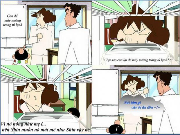 Rất nhiều người lớn khi đọc truyện cho rằng, yếu tố bạo lực cũng hay xuất hiện dưới nhiều góc độ khác nhau, như mẹ luôn quát mắng và thẳng tay trừng trị Shin với sức mạnh cơ bắp. Một số cảnh đánh nhau trong truyện với những câu quát tháo kiểu: Đồ thối tha; Thằng ranh con; Cút ngay... Thậm chí, mẹ chỉ quấn mỗi chiếc khăn tắm và đuổi theo Shin đang chơi trò biến thái ngoài đường trước mặt phụ nữ.