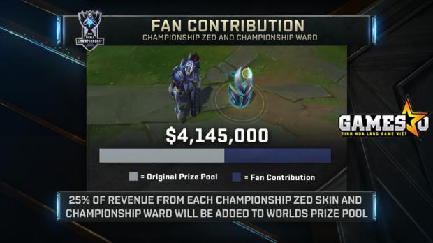 Nhưng lần đầu tiên kể từ kỳ CKTG năm nay, Riot đã quyết định gây quỹ theo hình thức Crowdfunding (kêu gọi sự hỗ trợ từ cộng đồng người chơi LMHT) bằng việc mua trang phục Zed Vinh Quang và Mẫu Mắt Vinh Quang để trích 25% lợi nhuận thu được bổ sung vào giá trị giải thưởng.