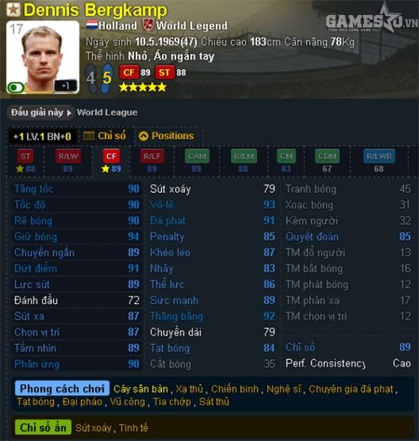 Huyền thoại người Hà Lan có 2 chỉ số ẩn: Tinh tế, Sút xoáy. Với phiên bản gameplay mới sút Z+D thì D. Ở ngoài đời, khán giả biết đến ông với biệt danh ‘người Hà Lan không bay’ vì Bergkamp bị chứng sợ bay. Nhưng với phiên bản World Legend trong FIFA Online 3, Bergkamp có thể bay cao được rồi!