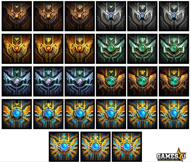 Từ trái sang phải, từ trên xuống dưới thể hiện đấu Xếp Hạng đơn, 3v3 và 5v5 ở các cấp bậc Đồng, Bạc, Vàng, Bạch Kim, Kim Cương, Cao Thủ và Thách Đấu (có tới chín biểu tượng khác nhau dành riêng cho những người chơi đứng đầu máy chủ).