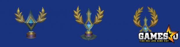 Từ trái sang phải, từ trên xuống dưới thể hiện đấu Xếp Hạng đơn, 3v3 và 5v5 ở các cấp bậc Đồng, Bạc, Vàng, Bạch Kim, Kim Cương, Cao Thủ và Thách Đấu (có tới chín biểu tượng khác nhau dành riêng cho những người chơi đứng đầu máy chủ).