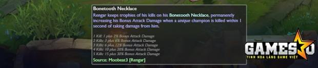 - Dây Chuyền Răng Nanh tăng STVL cộng thẳng và % STVL dựa trên lượng tướng địch Rengar tiêu diệt được.