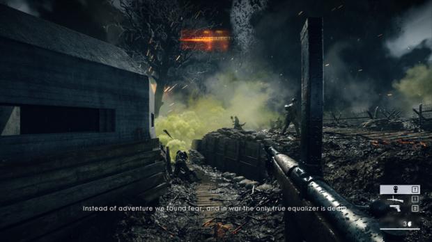 Thế nhưng năm nay DICE có vẻ đã làm hết sức để “sửa sai”, tạo ra một phần chơi đơn mãn nhãn và ấn tượng hơn, đem lại cảm giác của một siêu phẩm lấy đề tài chiến tranh thế giới, nơi những con người trên chiến trận phải làm mọi điều để hoàn thành nhiệm vụ. Những hình ảnh đầu tiên, cũng là màn chơi đầu tiên DICE dẫn dắt game thủ đến với chiến trường rộng lớn, cho tới khi anh chàng lính tank người Anh thuật lại câu chuyện của bản thân, cùng với đó là những chương hồi, nơi những con người khác nhau, những góc nhìn khác nhau tạo ra một bức tranh toàn cảnh về cuộc chiến tranh đẫm máu đầu thế kỷ XX.