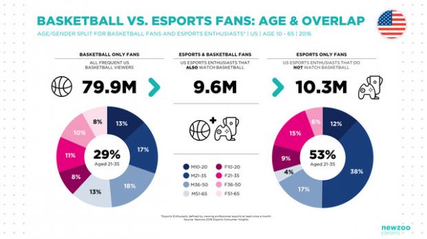 - Trong số 80 triệu fan bóng rổ tại Mỹ, 9,6 triệu người cũng có theo dõi eSports. eSports có tiềm năng thu hút thêm 10,3 triệu fan mới cho các câu lạc bộ bóng rổ.