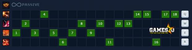 - Nâng kỹ năng: E, W, E, Q rồi theo tiến trình ưu tiên R > E > W > Q.