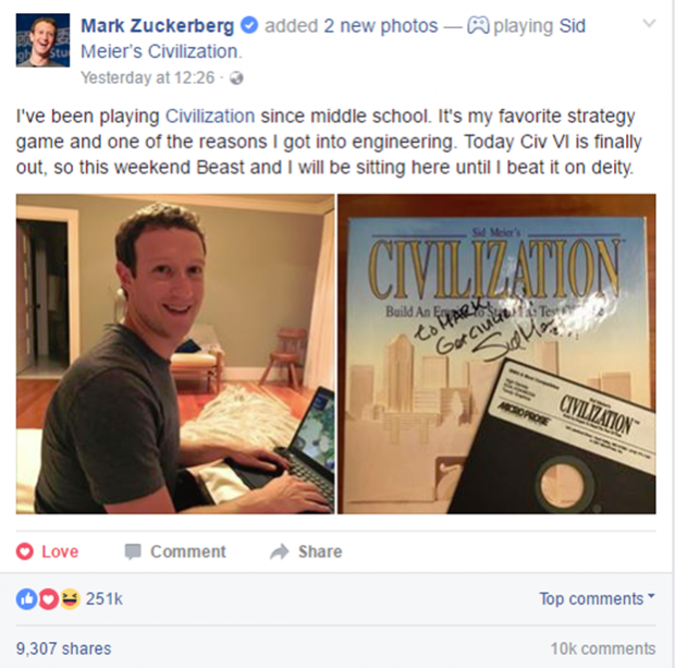 Cũng như bao game thủ khác, Mark Zuckerberg – cha đẻ của mạng xã hội Facebook cũng đã dành ra 2 ngày cuối tuần của mình để tung hoành trong Civilization VI. Theo như chia sẻ trên chính trang cá nhân của mình, Mark đã chơi tựa game này từ thời trung học và đây cũng là lý do khiến anh theo đuổi ước mơ trở thành kỹ sư công nghệ.