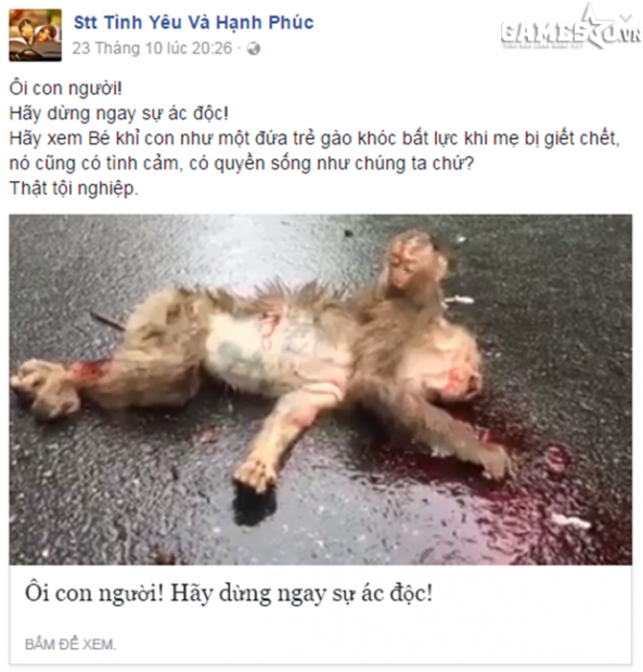 Được biết, mẹ của chú khỉ con đã bị xe máy tông chết khi đang băng sang đường. Ban đầu tưởng mẹ mình ngủ, chú khỉ tìm cách lay khỉ mẹ dậy, nó nhìn ra xung quanh để cầu cứu những người qua đường. Nhưng sau đó nhận ra mẹ mình đã chết, khỉ con kêu khóc càng to hơn và chỉ biết nhìn mẹ mình chết trong vô vọng.