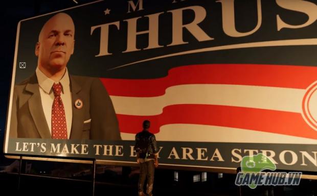 Theo đó quả các bảng quảng cáo được dựng đầy trong game, người chơi có thể nhìn thấy hình ảnh chính trị gia có tên Mark Thruss (phiên bản không tóc) với câu nói 'Let's make the Bay Area stronger!'. Đây chính là câu nói ám chỉ biểu ngữ gắn liền với Donald Trump là 'Make America Great Again'. Trên tất cả, Trump trong tiếng Anh là 'Kèn' và Thruss có nghĩa là 'Thổi', cho thấy câu chơi khăm cực kỳ hiểm hóc của Ubisoft.