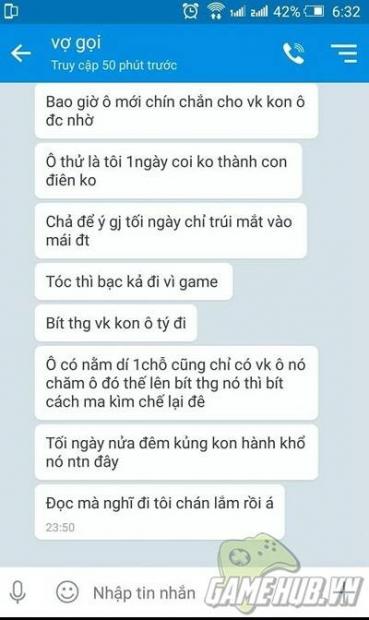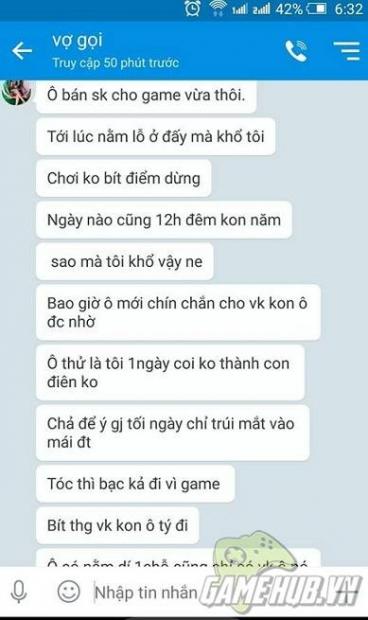 “Ông bán sức khỏe cho game vừa thôi. Tới lúc nằm lỗ ở đấy mà khổ tôi. Chơi không biết điểm dừng. Sao tôi khổ vậy, bao giờ ông mới chín chắn cho vợ con ông được nhờ. Ông thử là tôi một ngày coi có thành con điên không. Chả để ý gì tối ngày chỉ chúi mắt vào máy điện thoại. Tóc thì bạc cả đi vì game. Biết thương vợ con ông tý đi. Ông có nằm dí một chỗ cũng chỉ có vợ ông nó chăm ông đó, thế nên biết thương nó thì biết cách mà kiềm chế lại đi. Đọc mà nghĩ đi, tôi chán lắm rồi”.