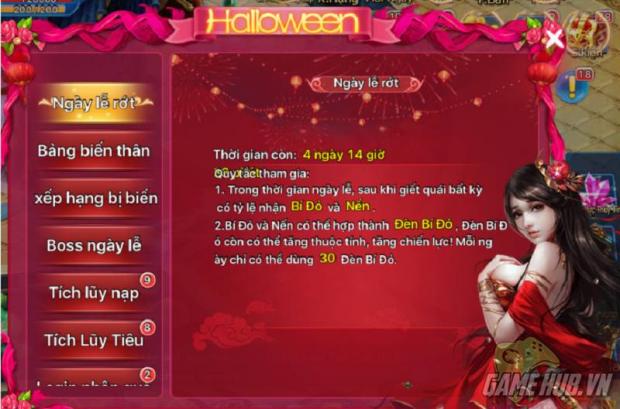 Bên cạnh đó, các anh hùng chắc chắn không nên bỏ lỡ chuỗi sự kiện Halloween vô cùng đặc sắc và hấp dẫn được diễn ra từ 29/10 – 5/11/2016 bao gồm: Ngày lễ rớt, Bảng biến thân, Xếp hạng bị biến, BOSS ngày lễ, Tích lũy nạp, Tích lũy tiêu, … để có cơ hội nhận được nhiều vật phẩm giá trị trong game khiến con đường chinh phục tiên giới trở nên thuận lợi hơn bao giờ hết.