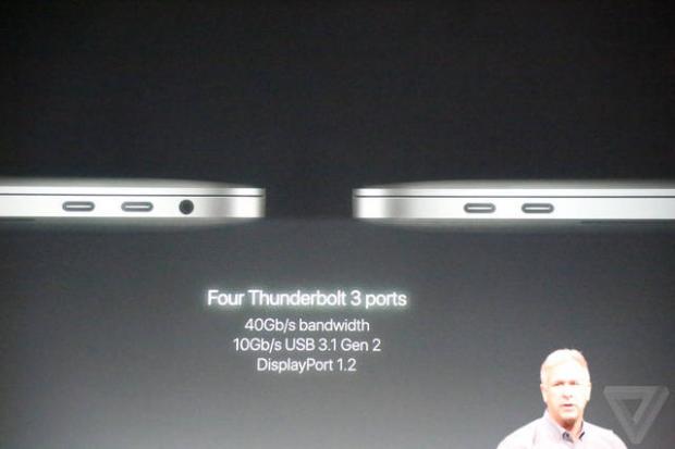 Các cổng kết nối trên MBP 2016 cũng có khá nhiều đổi mới. Có tới 4 cổng Thunderbolt 3, và cũng chỉ có duy nhất 4 cổng kết nối này, các cổng này vừa cho phép truyền dữ liệu, vừa có khả năng sử dụng làm cổng sạc của MBP. Băng thông lên tới 40Gb/s, tốc độ copy dữ liệu qua USB 3.0 là 10Gb/s, đồng thời Thunderbolt 3 cũng là một cổng xuất hình ảnh DisplayPort 1.2.
