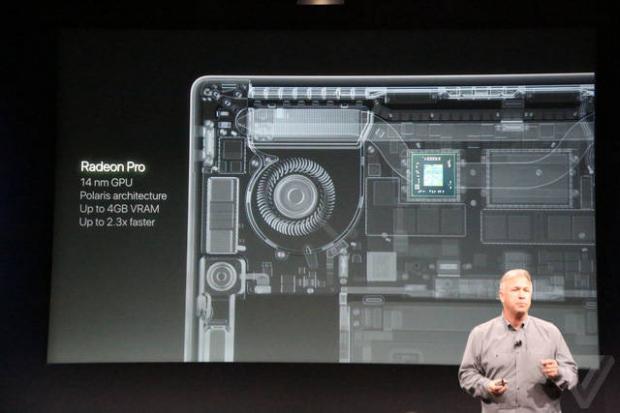 Công nghệ đồ họa trên MBP mới chắc chắn sẽ là GPU Polaris của AMD, trong slide thuyết trình thì Apple đã nêu ra đó là một Radeon GPU và được sản xuất trên tiến trình 14nm, chắc chắn là Polaris rồi. GPU này sẽ có 4GB VRAM và mang tới sức mạnh đồ họa gấp tới 2,3 lần so với trước đây.