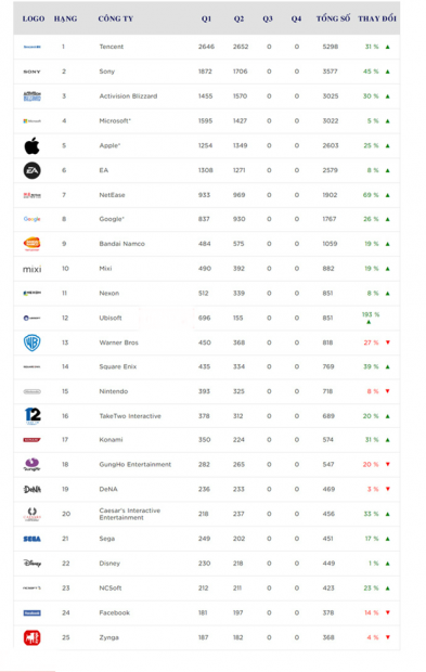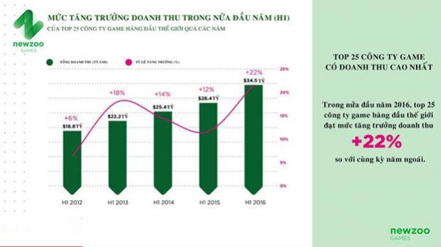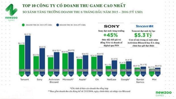 Theo như báo cáo quý mới nhất về thị trường game toàn cầu của Newzoo, trong nửa đầu năm 2016, doanh thu top 25 công ty game toàn cầu đã tăng trưởng 22% so với cùng kỳ năm ngoái, đạt con số kỷ lục mới: 34,5 tỷ USD (hơn 770 nghìn tỷ VNĐ). Mảng mobile tiếp tục là nguồn động lực chính cho sự phát triển này, mang lại 40% doanh thu cho top 10 công ty đầu tiên. “Ông lớn” Tencent tiếp tục trở thành công ty game lớn nhất thế giới với tổng doanh thu lên tới 5,3 tỷ USD. Bên cạnh đó, hàng loạt các công ty Châu Á cho thấy mức tăng trưởng vượt trội như Sony, NetEase, Mixi và Konami.