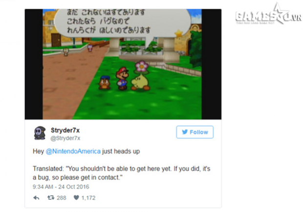 Stryder7x sau đó đã đăng tải hình chụp thông điệp nói trên trong phiên bản tiếng Nhật của Paper Mario trên trang Twitter của mình, nhưng đáng tiếc là về phía Nintendo hãng game này lại không đưa ra hồi âm nào thỏa đáng cả.