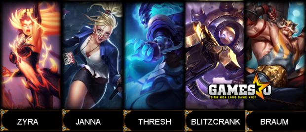 Blitzcrank (Đa dụng): Khi mà Janna và Thresh luôn tạo động lực cho đội tiến lên phía trước, Blitzcrank lại có chiều hướng chơi phòng thủ và tước đoạt đi mối nguy hại đến từ kẻ địch…Với cú kéo trứ danh, Blitz hoàn toàn có thể tạo ra được lợi thế tuyệt vời trong giao tranh tổng mà không cần tiến tới quá sát vị trí của đối phương. Khả năng tăng tốc tức thời có thể giúp Blitz hiện thực hóa điều này.
