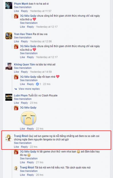 Ngay lập tức, bài post facebook trên đã nhận được lượt like và comment khủng từ cộng đồng game thủ, chủ yếu là những tranh cãi xung quanh việc 3Q Siêu Quậy còn quá nhỏ bé để so sánh với một cái tên đình đám lên tầm thế giới như Clash of Royale. Thậm chí có game thủ còn lo lắng cảnh báo Admin nên xóa post ngay nếu không muốn bị fan kéo sập Fanpage