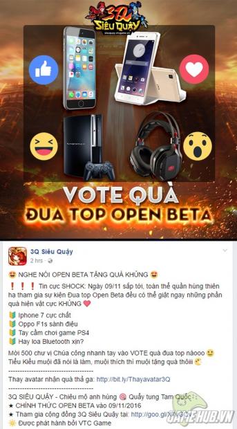 Đặc biệt, trên Fanpage chính thức của 3Q Siêu Quậy (tại: https://www.facebook.com/sieuquay.vtcgame.vn/) vừa hé lộ một thông tin cực HOT. Đó là game thủ tham gia sự kiện Đua top Open Beta sẽ được nhận ngay những phần quà “khủng” như: Điện thoại iPhone 7, Điện thoại Oppo F1s, PlayStation 4 hoặc Tai nghe Bluetooth chất chơi… Bạn đọc quan tâm chỉ cần tham gia sự kiện, vote phần quà mình mong muốn và ngay lập tức có cơ hội giật ngay hiện vật “xịn” về tay. Quá đã!