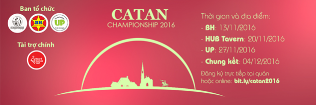 Giải đấu Catan Championship 2016 lần này do Board Game Việt cùng BH Board Game, Hub Tarven và Trà sữa Up đồng tổ chức với mục đích phổ biến cùng lan truyền niềm vui của Board Game nói chung và Catan nói riêng tới mọi người.