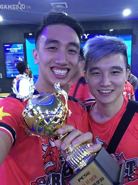 Quân Bi (bên trái) cùng người đàn anh Quang Barca với chức vô địch PES Team Challenge Cup 2016.