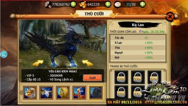 Bên cạnh đó, Thú cưỡi là tính năng được giới thiệu cho các người chơi ngay từ khi gia nhập Hoa Sơn Luận Kiếm 3D, tuy nhiên bảo mã khó kiếm, thực sự không dễ dàng để có thể sở hữu bảo mã trong Hoa Sơn Luận Kiếm. Mỗi thú cưỡi lại có những yêu cầu khác nhau để kích hoạt , Sau khi kích hoạt Bảo mã các vị chưởng môn sẽ được gia tăng chiến lực rất nhiều.
