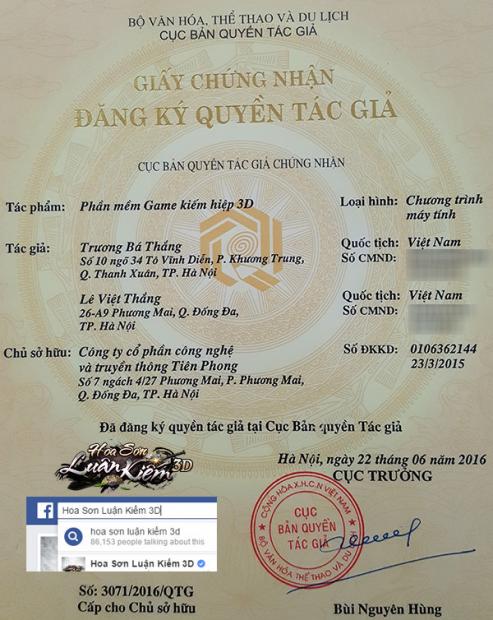 Một điểm đáng chú ý trong lễ ra mắt, đó là việc Hoa Sơn Luận Kiếm 3D đã được Cục bản quyền tác giả, Bộ VH-TT-DL chứng nhận quyền tác giả phần mềm, đồng thời được Facebook xác minh “chính chủ”. Đây là một yếu tố giúp người chơi Việt Nam hoàn toàn yên tâm khi tham gia sản phẩm.