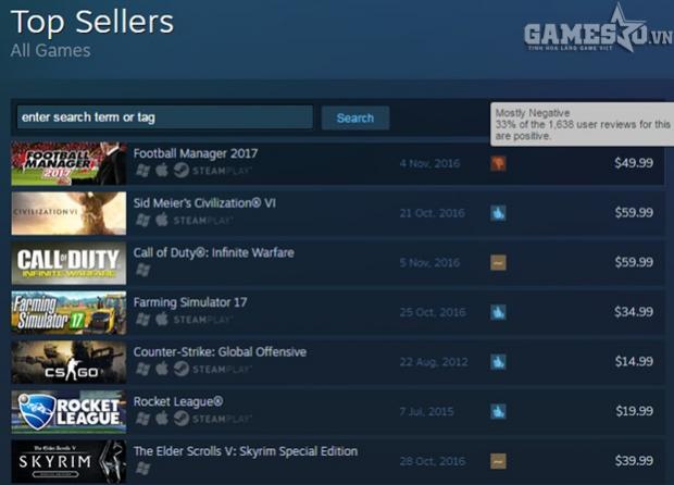 Tuy nhiên, có một thực tế là cho dù đã bị game thủ Trung Quốc “dìm hàng” hết mức, FM 17 vẫn đang chiễm chệ trên ngôi đầu bảng xếp hạng những tựa game bán chạy nhất tuần qua của Steam. Để có được thành tích này, tựa game của Sports Interactive đã vượt qua hàng loạt đối thủ nặng ký như Civilization 6, Call of Duy: Infinite Warfare hay Counter-Strike: Global Offensive (CS:GO). Thế mới biết, “hữu xạ tự nhiên hương”. Với một sản phẩm thực sự tốt, dù có bị “dìm hàng” đến đâu thì vẫn sẽ tìm chỗ đứng thực sự của mình.