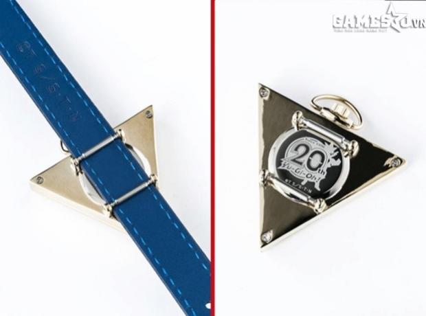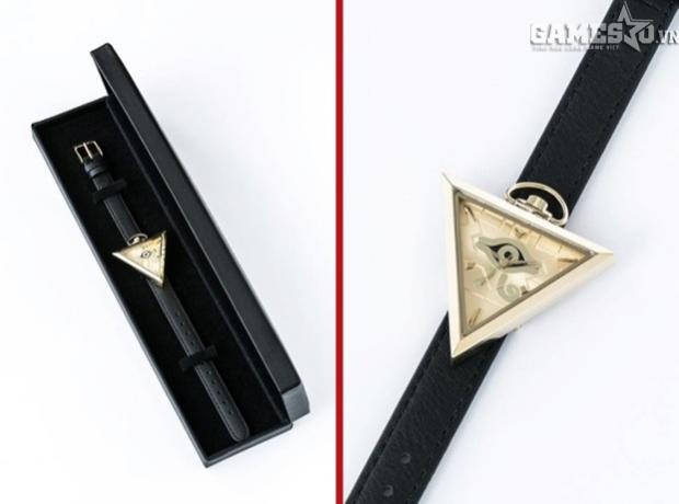 Những gì chúng ta đang xem ở đây là đồng hồ đeo tay để kỷ niệm 20 năm Yu-Gi-Oh!. Nổi bật trong số đó, có một chiếc đồng hồ được thiết kế cực kỳ đặc biệt. Nó có dạng tam giác và mang hình ảnh của Millennium Puzzle. Không chỉ vậy, mặt đồng hồ có thể tháo rời khỏi dây da, và móc vào dây xích mạ bạc để bạn đeo quanh cổ như “Trò Chơi Ngàn Năm” thực sự nếu muốn, và trông vẫn vô cùng thời trang.