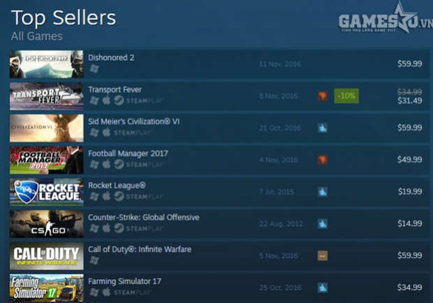 Để đạt được thành tích này, Dishonored 2 đã vượt qua hàng loạt cái tên nổi bật như Transport Fever, Civilization VI và đặc biệt là Football Manager 17 - tựa game đã dẫn đầu danh sách này trong tuần trước.